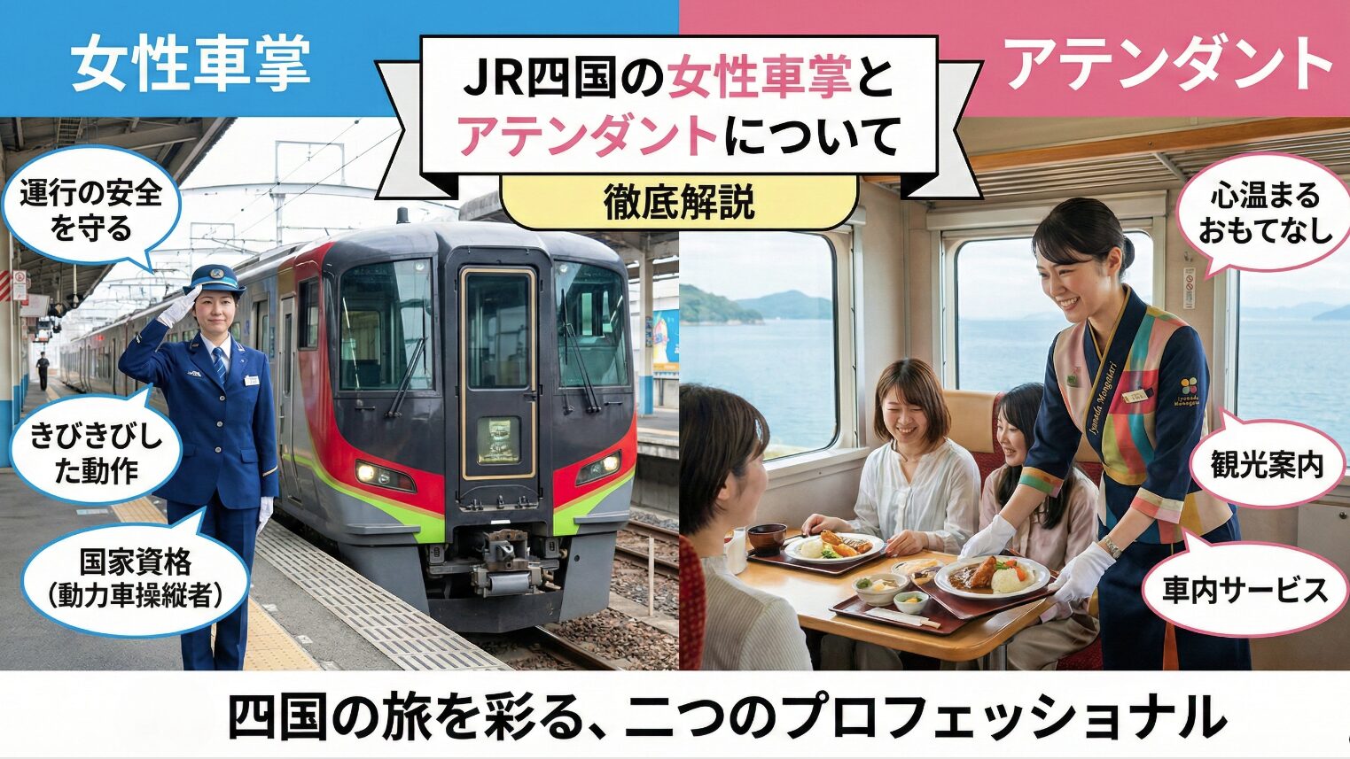乗客の目線から見ると、笑顔で迎えてくれる制服姿のスタッフはまとめて「女性車掌」に見えがちですが、JR四国の内部では車掌と観光列車アテンダントは別の職種としてきちんと役割分担されています。その違いを理解しておくと、「なりたい仕事はどっちか」を考えるときのヒントになりますよ。